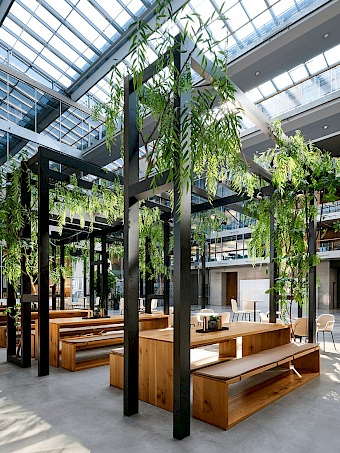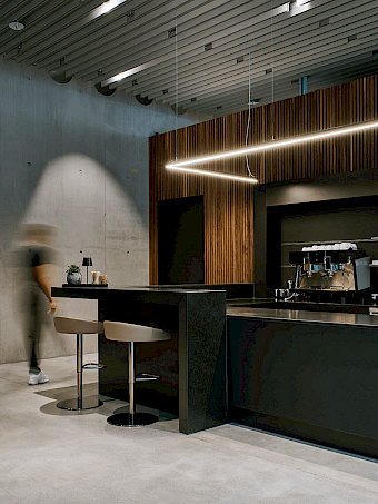 - Lieferung und Konstruktion von Tresenelementen aus Terrazzo sowie Self-Checkout-Kassen, Beleuchtung, Möbel und Elektrogeräten. Entwicklung und Montage eines dreiteiligen Lamellen-Schiebetors aus amerikanischem Nussbaum mit einer Länge von 9 Metern, freitragender Konstruktion und speziell durchgeführter statischer Berechnung. Lieferung akustisch wirksamer Wandelemente und einer freistehenden, leicht demontierbaren Pergola.