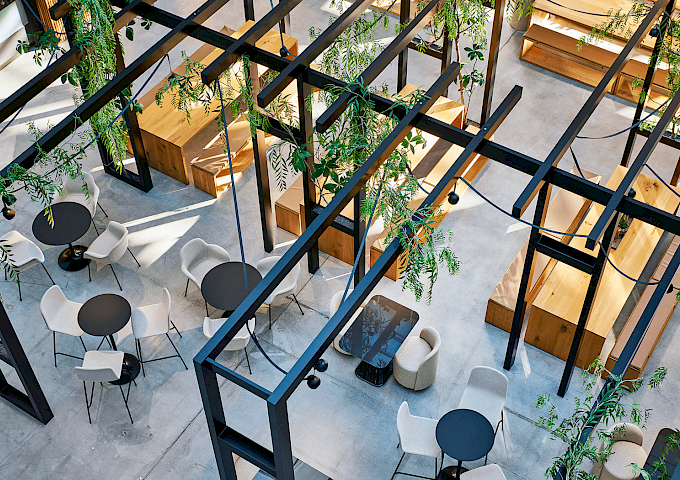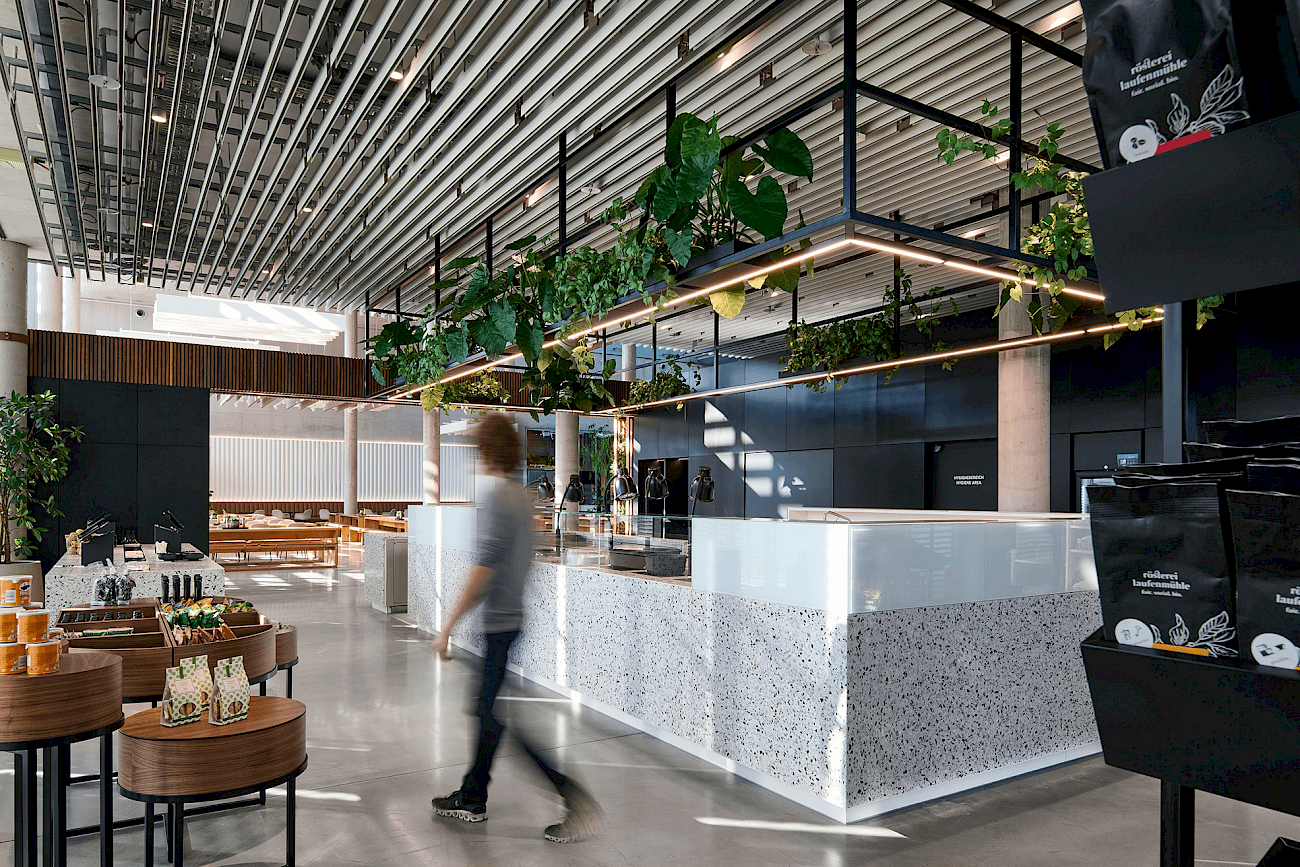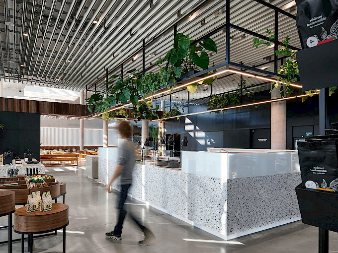 Das Deli steht für einen modernen Raum, der Form und Funktion miteinander kombiniert. Von den charakteristischen Terrazzo-Tresen über durchdachte Self-Checkout-Systeme bis hin zu maßgeschneiderter Beleuchtung und hochwertigem Mobiliar wurde jeder Aspekt gezielt auf die Bedürfnisse der Mitarbeitenden abgestimmt.