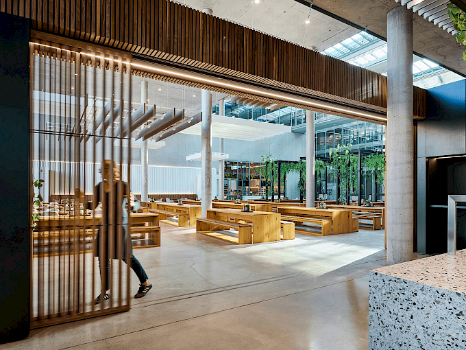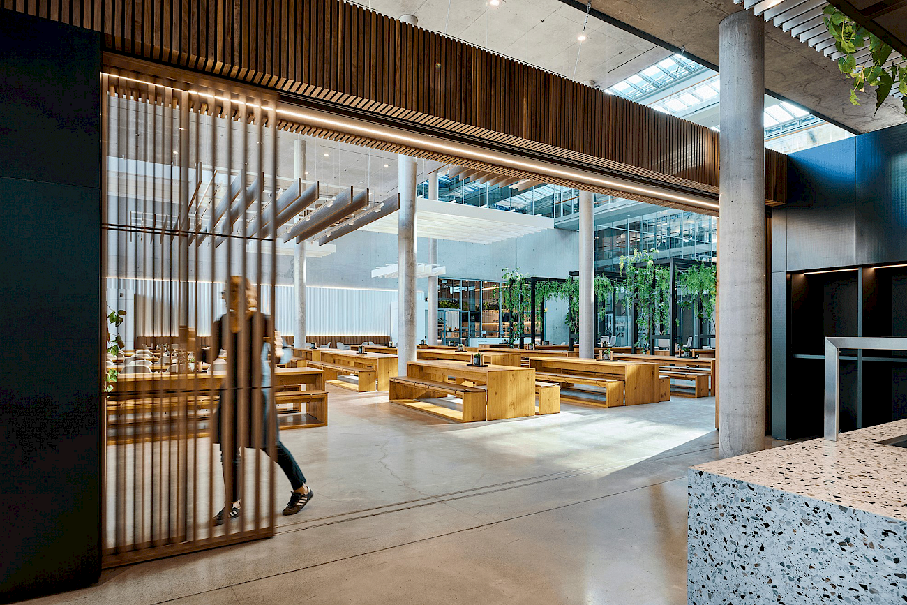 Das Deli ist rund um die Uhr geöffnet, sodass die Mitarbeitenden jederzeit auf ein Angebot von Speisen und Getränken zugreifen können – eine Kombination aus Verfügbarkeit, Stil und Effizienz, die modernen Arbeitsumgebungen gerecht wird.