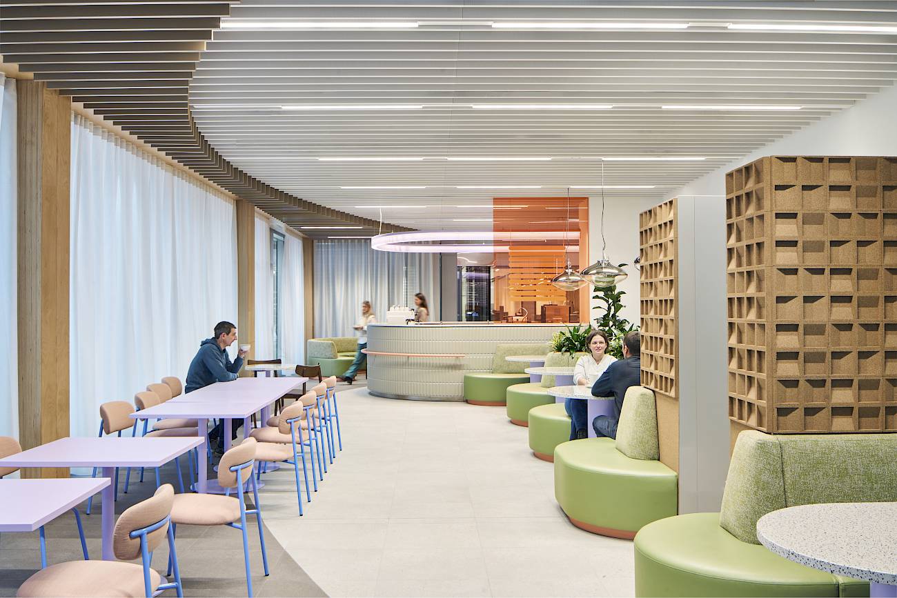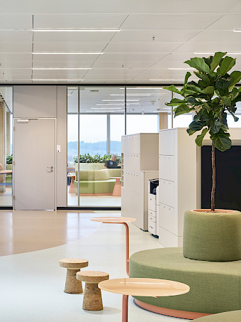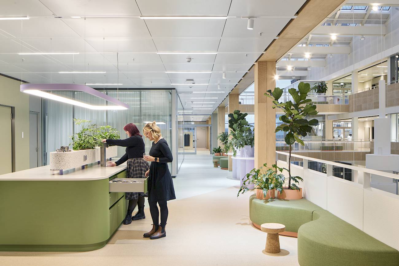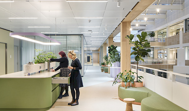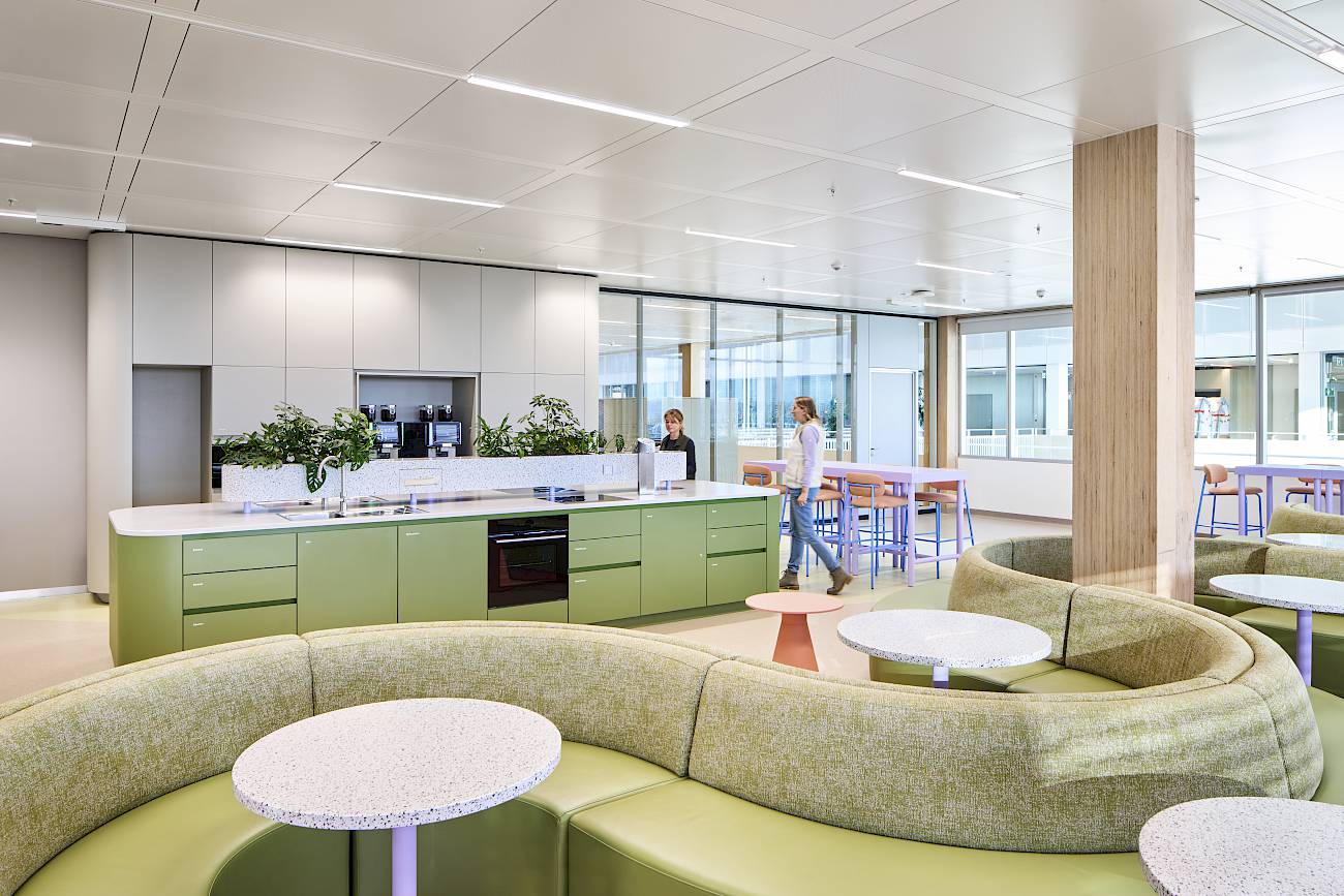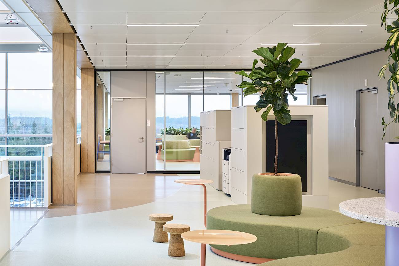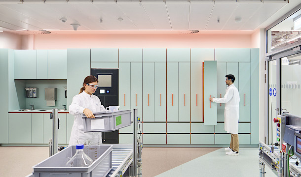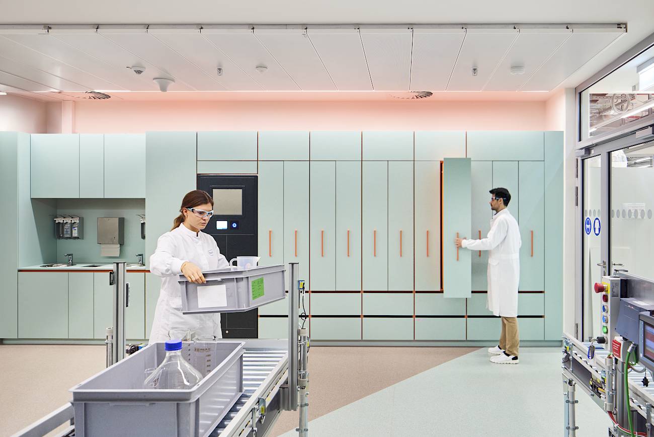 Die Einbauten erstrecken sich über Büroflächen, Atrium, Brücken sowie ausgewählte Bereiche innerhalb der Laborumgebung. Besonders hohe Anforderungen stellte dabei die Umsetzung der Hygienemöbel im Laborbereich: Diese wurden vollständig nicht brennbar ausgeführt und unter strengen technischen sowie sicherheitsrelevanten Vorgaben geplant und realisiert.