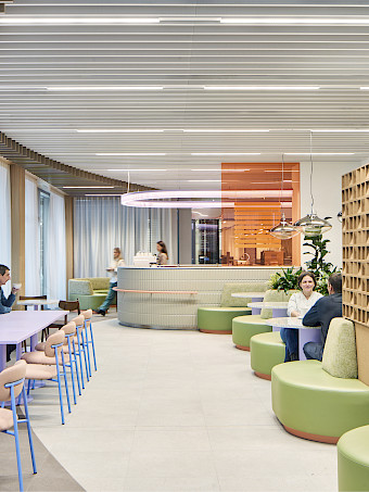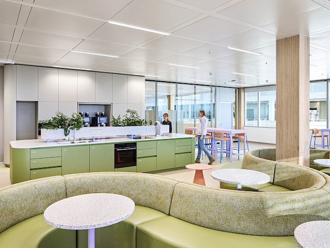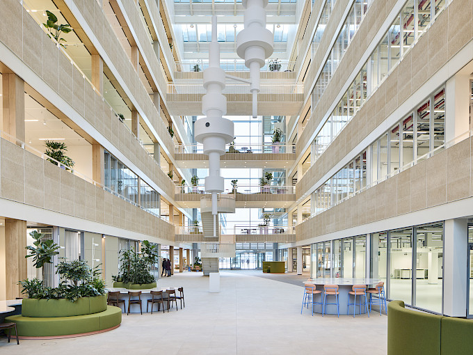 Das Gebäude mit einer Bruttogeschossfläche von ca. 35.500 m² vereint Büro- und Laborbereiche über sieben Vollgeschosse hinweg. Ein zentrales architektonisches Element bildet das Atrium mit verbindenden Brücken, die als kommunikative Schnittstellen zwischen den unterschiedlichen Funktionsbereichen dienen. Ganter verantwortete die Umsetzung zentraler Innenausbauleistungen und realisierte in enger Abstimmung mit dem Innenarchitekturbüro Studio Alexander Fehre maßgeschneiderte Lösungen für die unterschiedlichen Nutzungszonen. Zum Leistungsumfang gehörten unter anderem individuell gefertigte Möbel, Küchen, Tische, Wandanlagen sowie zwei prägnante Sitztreppen.
